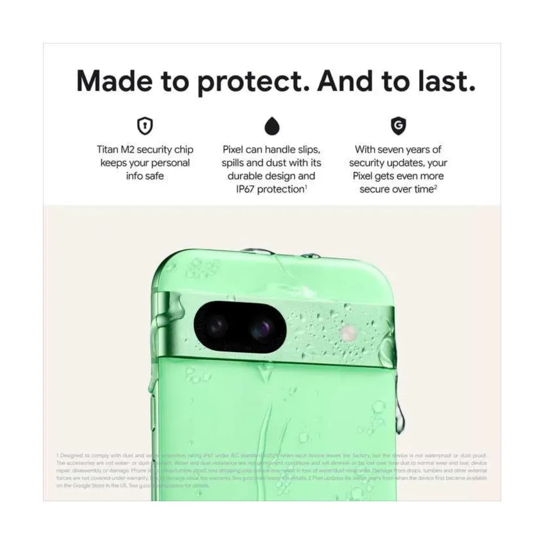 Pixel 8a is Google’s most durable A-Series phone yet, with a metal frame and camera bar. With IP67 protection, it can handle water and dust. It has a new scratch-resistant Actua display, and it’s made with recycled aluminium, glass and plastic. And it’s designed with a smooth finish and a matte back cover.
