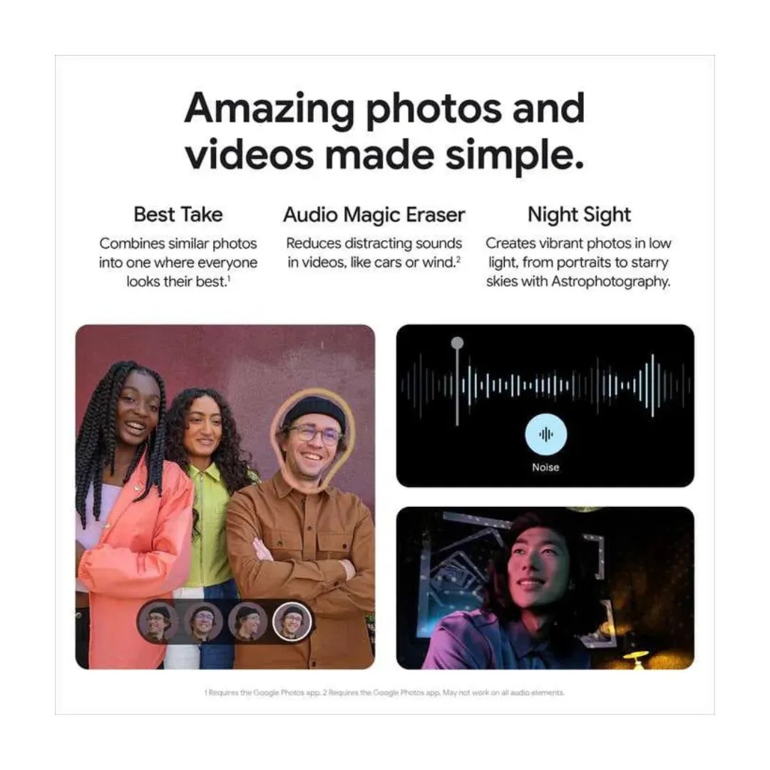 Pixel phones, watches, and earbuds are powered by Google AI for personalised help throughout your day. So that you can save time, live healthier, and get more done. Take stunning photos and videos, and easily edit them. Track your health and fitness with the power of Fitbit. And have peace of mind with Safety Check and Emergency SOS.