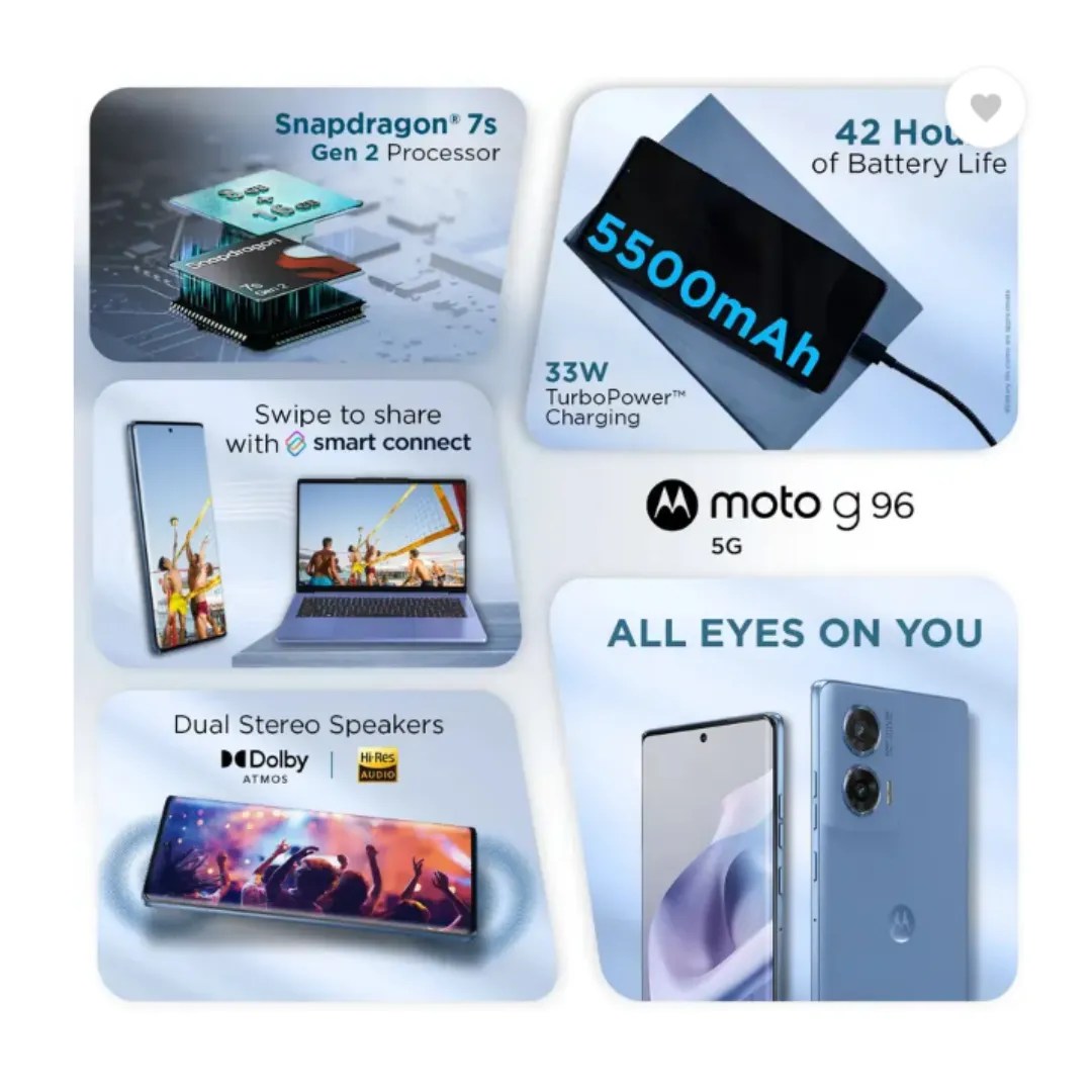 Embrace elegance in 4 ultra-premium Pantone curated vegan leather designs with 4 different vegan leather finishes for the first time in any g-series smartphone. Style with the colourful & harmonious design of moto g96 5G. Introduced with a 3D curved design and with ultra-premium finishes, and a light, ultra-thin frame, it’s extremely comfortable and satisfying to hold. Experience the luxurious vegan leather finish for a soft, tactile feel with an added touch of luxury. Paired with an ultra-lightweight build of just 178g and a super slim profile at 7.93mm, this device redefines premium comfort even with the massive 5500mAh battery inside.