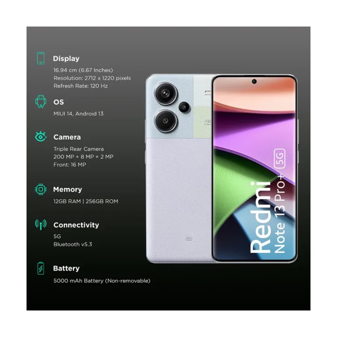 The Redmi Note 13 Pro+ 5G is a symphony of innovation, luxury, and power. With Fusion Design, a 3D Curved AMOLED Display, In-Display Fingerprint Sensor, Sharp 1.5K Resolution, Flagship IP68 Protection, Elegance Meets Endurance, True 200 MP With OIS, 120 W HyperCharge, and the Global Debut of the MediaTek Dimensity 7200 Ultra-5G, this SuperNote transcends the realm of smartphones. It’s a masterpiece that blends art and technology seamlessly, offering an unparalleled experience that goes beyond expectations. Elevate your mobile journey with the Redmi Note 13 Pro+ 5G – where innovation meets perfection.